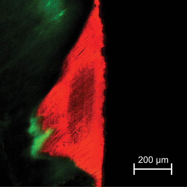 As of this writing, four in vitro and eight in vivo studies on caries infiltration have been completed or are continuing throughout the world. Confocal laser scanning microscopy has been used to document resin penetration depths as well as to verify lesion depths and the lack of progression after infiltration (DMG, data on file) (Figure 1).84
