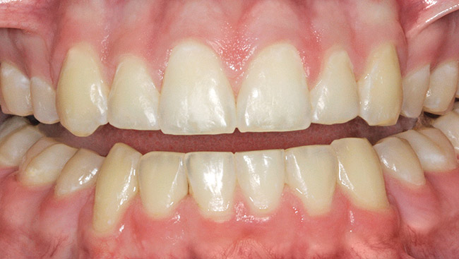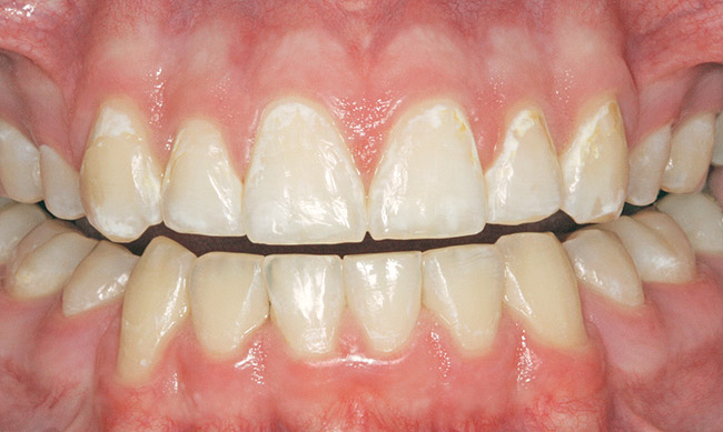 Dental caries is a complex, multifactorial, infectious, and chronic disease process1 caused when the byproducts of bacteria diffuse into tooth enamel and dentin and dissolve the mineral.14 Caries occurs as a result of a continuum of cyclic demineralization and remineralization of enamel.15 The formation of plaque biofilm enables the proliferation of acidogenic, aciduric, and cariogenic bacteria1,16-19 and consequently reduces salivary pH.20 Frequent consumption of dietary sugars and acidic drinks21 throughout the day further prolongs periods of low pH.1 Such extended periods cause an overgrowth of pathogenic oral bacteria, which produces acid. This in turn leads to a loss of mineral content in the tooth and caries progression into the tooth.1,20,22,23 White spot lesions develop when acids have diffused into and begun to demineralize the subsurface enamel. This is often associated with areas of plaque accumulation around orthodontic brackets. If the demineralization process is not stopped, the intact enamel surface eventually collapses and cavitates.13 The acquired pellicle has been shown to delay the progress of remineralization.24 In theory, managing the oral pH and concentrating on acid-producing microorganisms and fermentable carbohydrates might be a logical step in controlling the demineralization process; however, recent research has shown eliminating specific microorganisms may not be advisable because they are members of an endogenous microflora.24