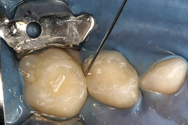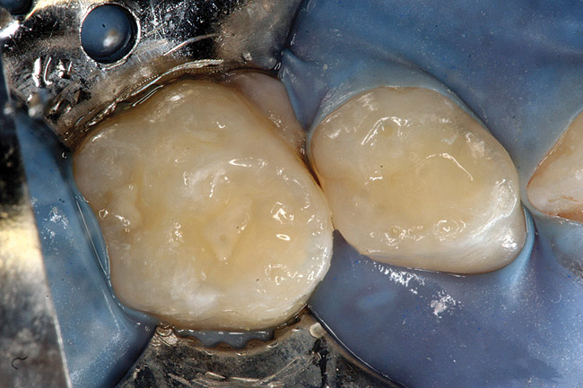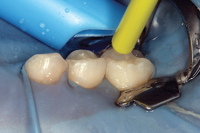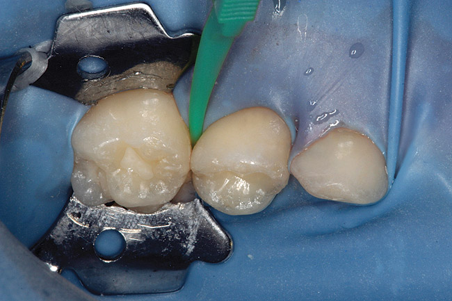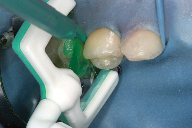 Caries infiltration is a simple, straightforward technique. Before treatment, the tooth should be thoroughly cleaned and isolated with a rubber dam (Figure 5 and Figure 6). Treatment kits contain all of the materials required for the technique (except the rubber dam), including specially designed proximal tips that are used for accurate delivery of the acid etch and infiltrant resin during the procedure. These carriers consist of an ultrathin film perforated on one side for direct placement at the treatment site, which protects adjacent teeth. The tips swivel 360°, allowing application from different angles. All syringes contained in the kit are screw-type applicators, which ensure controlled extrusion of the materials.