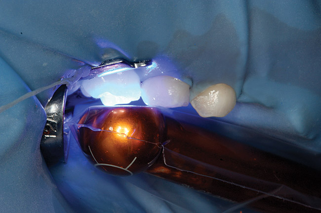 Specially designed dental wedges are inserted to slightly separate the carious tooth from adjacent teeth. A 15% hydrochloric gel is used to remove the "pseudointact" surface and open the pore system of the incipient lesion body (Figure 7).85 After rinsing (Figure 8), the area is dried with ethanol (Figure 9), followed by dry air. Then, the infiltrant is applied and allowed to penetrate the lesion pores by capillary action for 3 minutes (Figure 10). Any excess material is removed with dental floss, and the infiltrant is light cured from three angles for 40 seconds (Figure 11). A second layer of infiltrant is applied for 1 minute, and light cured for 40 seconds (Figure 12).86 It should be noted that the infiltrant is not radiopaque because fillers would affect the viscosity. Efficacy of the treatment can be tracked at future visits by lack of lesion progression.
