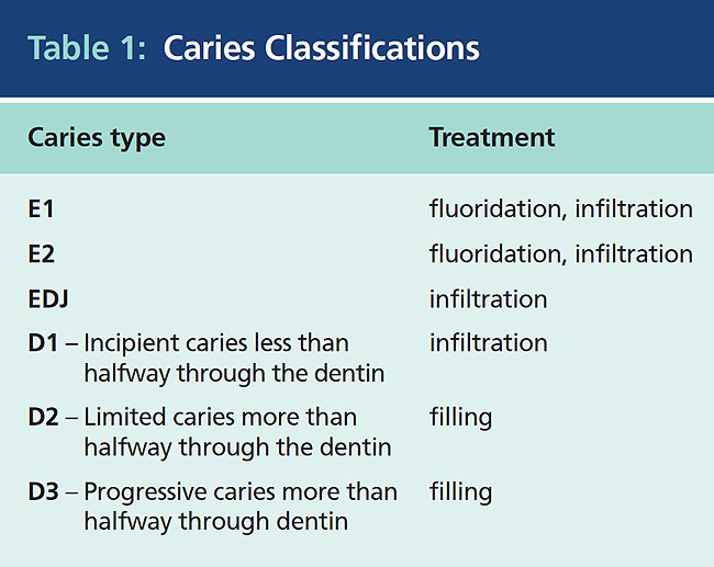 Caries infiltration is indicated for all age groups, up to the first third of dentin (D-1) (Figure 2). It is especially advantageous in interproximal areas, where a relatively large ratio of healthy hard tissue must be removed to eliminate carious tissue. Infiltration replaces hard tissue lost due to demineralization (to a maximum of 800 µm) with a low-viscosity resin, creating a barrier to further diffusion of carbohydrates and organic acids within the hard tissue, not on the tooth surface. This barrier stabilizes and effectively blocks the caries without changing the anatomic shape or appearance of the tooth.85 Additionally, treated lesions lose their whitish opaque color and blend with surrounding natural enamel, which is especially esthetic in the smooth surface type of lesions often found when fixed orthodontic appliances are removed (Figure 3 and Figure 4).